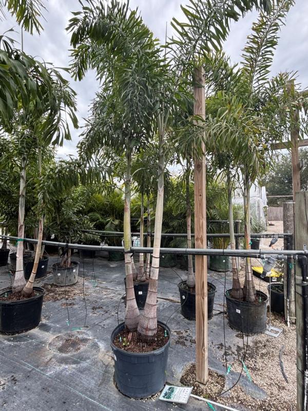 Foxtail Palm (Wodyetia bifurcata) is a graceful, fast-growing palm known for its full, bushy fronds that resemble a fox’s tail. It features a smooth, slender trunk and is popular for tropical landscaping in warm climates.