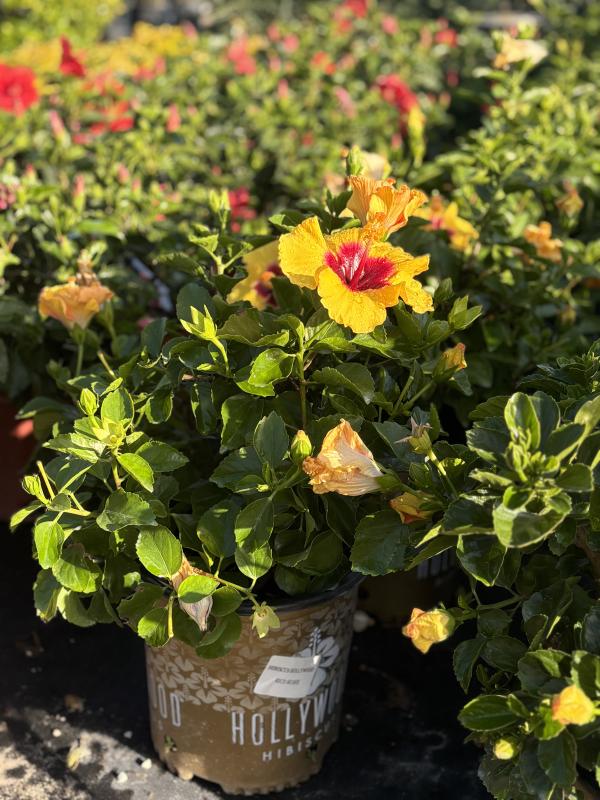 Hibiscus 'Hollywood Rico Suave' (Hibiscus rosa-sinensis 'Hollywood Rico Suave') is a vibrant tropical hibiscus celebrated for its bold yellow blooms with a striking red eye. As part of the Hollywood series, this cultivar offers a long blooming season and a compact, bushy growth habit, making it ideal for garden beds, borders, and containers.