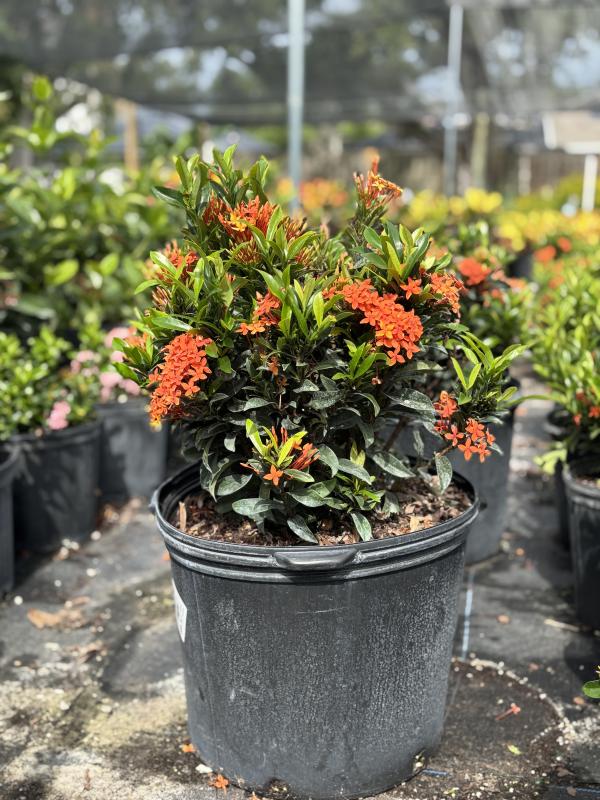Dwarf Carmen Orange Ixora (Ixora chinensis 'Dwarf Carmen Orange') is a compact tropical shrub known for its vibrant clusters of bright orange, star-shaped flowers and glossy, dark green foliage. This evergreen plant is ideal for adding a splash of color to smaller gardens, borders, and containers, with its abundant blooms providing visual interest throughout much of the year.