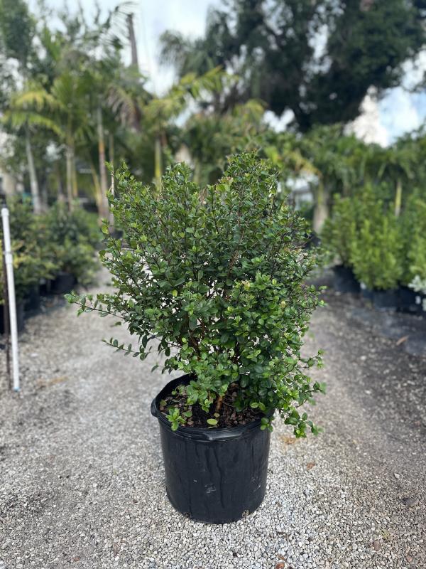 Simpson Stopper (Myrcianthes fragrans) is a dense, evergreen shrub native to Florida, often used as a hedge or foundation plant. It features small, glossy green leaves and produces fragrant white flowers followed by dark purple berries that attract birds. It is drought-tolerant and moderately salt-tolerant, thriving in full sun to partial sun conditions.