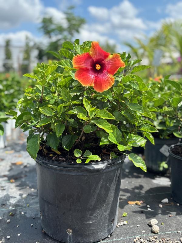 The Fiesta Hibiscus is a vibrant, tropical shrub that features large, striking flowers in shades of red, orange, and yellow, creating a dramatic display of color. This variety is known for its impressive blooms, which attract pollinators such as butterflies and hummingbirds, and is often used to create eye-catching focal points in gardens. Available in sizes ranging from 3 to 7 gallons, it thrives in warm climates and is perfect for both tropical and subtropical landscapes.