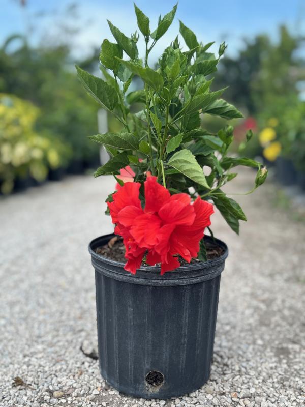 Double Red Hibiscus (Hibiscus rosa-sinensis 'Double Red') is a stunning tropical shrub known for its large, double-layered, vibrant red flowers and glossy green foliage. This dramatic plant is perfect for adding a bold splash of color to gardens, borders, and containers, with its abundant, eye-catching blooms providing vibrant color throughout the warmer months.