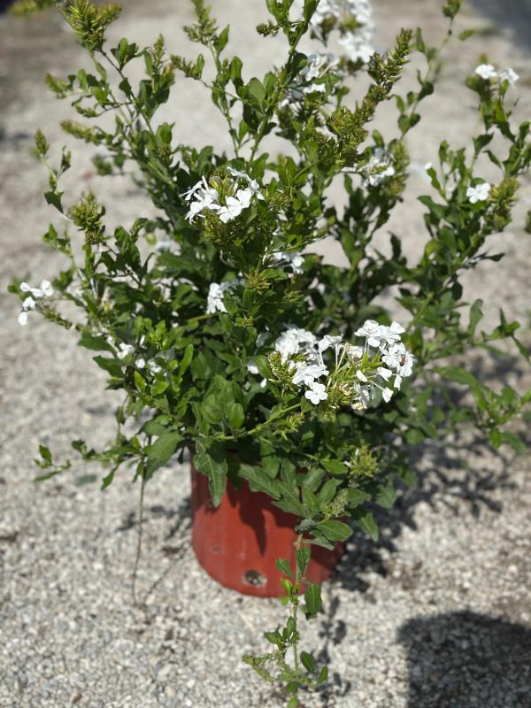 Plumbago (Plumbago auriculata) is a sprawling, evergreen shrub known for its beautiful clusters of blue or white flowers that bloom profusely throughout the year in warm climates. It has attractive, glossy green foliage and a moderate growth habit, often used as a ground cover, hedge, or in containers. Plumbago is well-suited to Florida landscapes, thriving in full sun and coastal areas, and it is a favorite for attracting pollinators like butterflies.