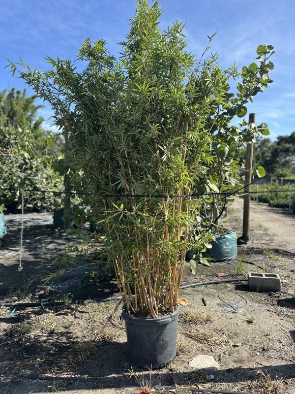 Bamboo 'Alphonse Karr' (Bambusa multiplex 'Alphonse Karr') is a clumping bamboo prized for its striking yellow canes with random green stripes and delicate green foliage. It is non-invasive, fast-growing, and forms a dense screen or hedge, making it ideal for privacy or ornamental use in tropical and subtropical landscapes.