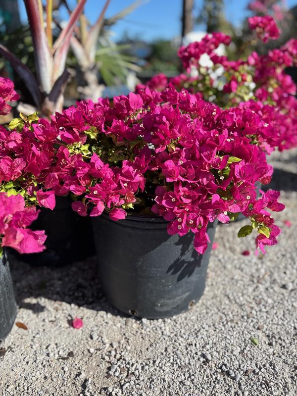 Sunstone Bougainvillea (Bougainvillea 'Sunstone') is a vibrant, evergreen climber known for its striking white or red bracts that provide a brilliant splash of color. This variety is often used in landscapes for covering trellises, walls, or fences, and can also be pruned into a shrub or standard form.