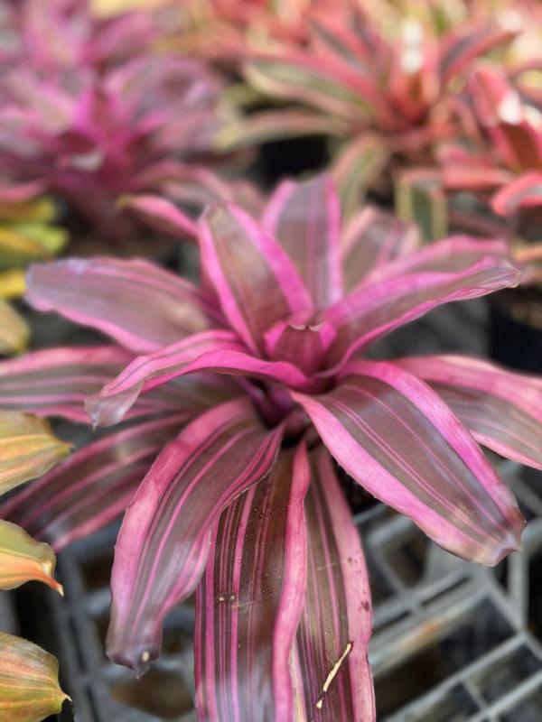 Bromeliad 'Neoregelia' (Neoregelia spp.) is a compact, low-growing bromeliad prized for its vibrant foliage rather than its flowers. Its broad, strappy leaves often feature striking colors like green, red, pink, or purple, sometimes with mottled or banded patterns. The central cup may turn a brilliant red or pink at flowering time, adding to its ornamental value.