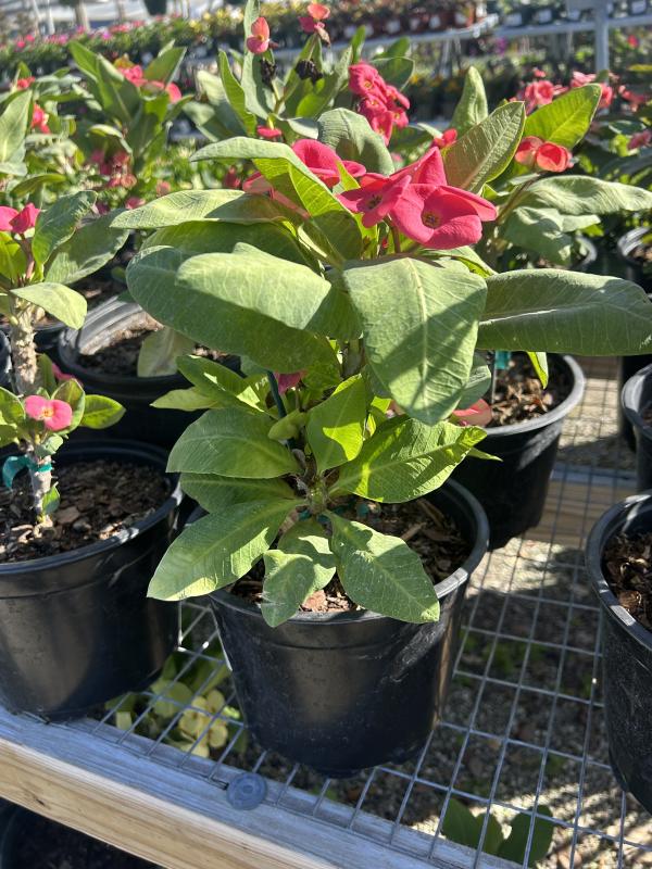 Crown of Thorns (Euphorbia milii) is a hardy, flowering succulent known for its spiny stems and clusters of vibrant blooms in red, pink, or yellow. It’s drought-tolerant, easy to care for, and a popular choice for containers or sunny garden beds in Florida landscapes.