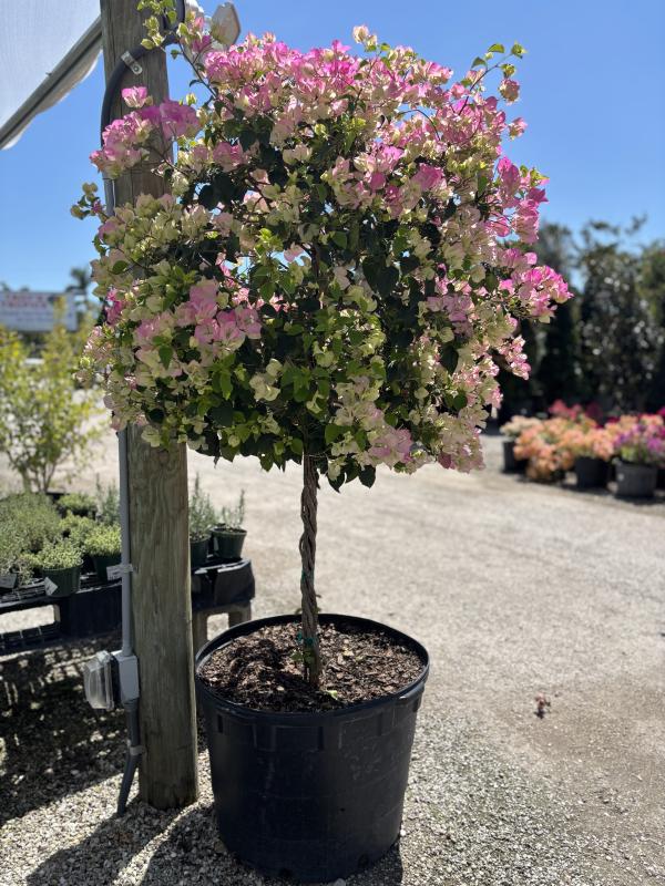 Thai Delight Bougainvillea (Bougainvillea 'Thai Delight') is a compact, ornamental shrub or small tree known for its brilliant deep pink to purple bracts and moderate growth habit. Often used in landscapes, containers, and as a specimen plant, it offers vibrant color and a manageable size, making it perfect for smaller spaces or as a focal point.