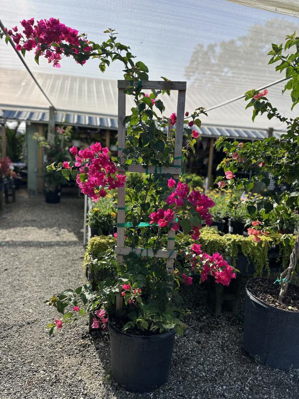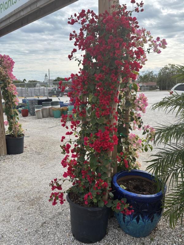 Barbara Karst Bougainvillea (Bougainvillea 'Barbara Karst') is a vibrant and vigorous climbing plant known for its striking magenta-red bracts that appear nearly year-round in warm climates. This evergreen climber is popular for covering walls, trellises, and fences, adding a splash of color to landscapes.