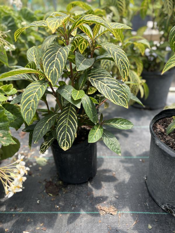 Sanchezia (Sanchezia speciosa) is a tropical shrub known for its large, glossy green leaves with bold yellow or white veins and its showy, tubular flowers. This plant thrives in warm, humid environments, making it an excellent choice for tropical gardens or shaded spots, where it can grow as a small shrub or accent plant.