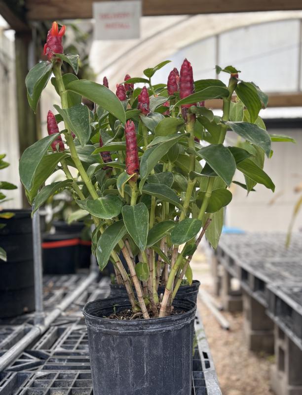 Button Ginger (Costus woodsonii), also known as Scarlet Spiral Flag, is a striking tropical plant with vibrant red, cone-shaped inflorescences that resemble buttons. This low-maintenance plant adds exotic flair to gardens and is perfect for creating lush, tropical landscapes. Its spiraling stems and glossy green leaves enhance its ornamental appeal.