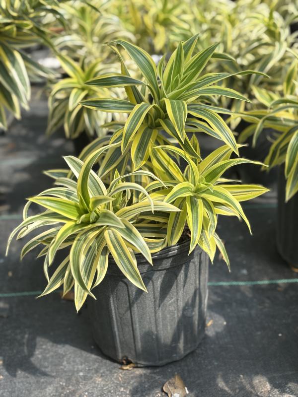 Song of India (Dracaena reflexa) is an attractive, slow-growing shrub or small tree known for its long, narrow leaves with green and yellow stripes. It is often used as a decorative indoor plant or in outdoor landscapes, providing a tropical feel and adding vertical interest with its slender, arching foliage.