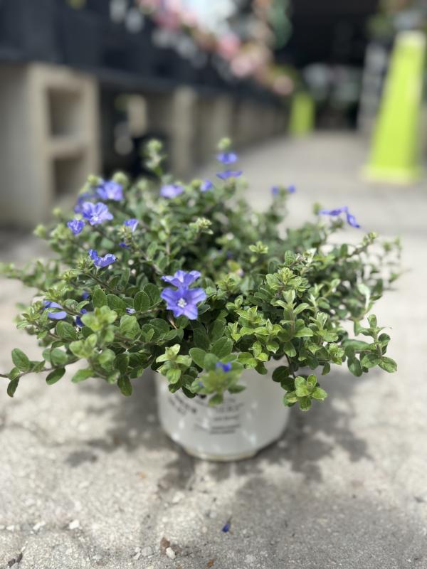 Blue Daze 'Blue My Mind' (Evolvulus glomeratus) is a vibrant, spreading perennial known for its stunning blue flowers and silver-green foliage. This cultivar is a popular choice for adding color and texture to gardens, patios, and containers. 'Blue My Mind' blooms prolifically in full sun and is heat- and drought-tolerant, making it ideal for Florida's climate, especially in coastal or xeriscaped landscapes.
