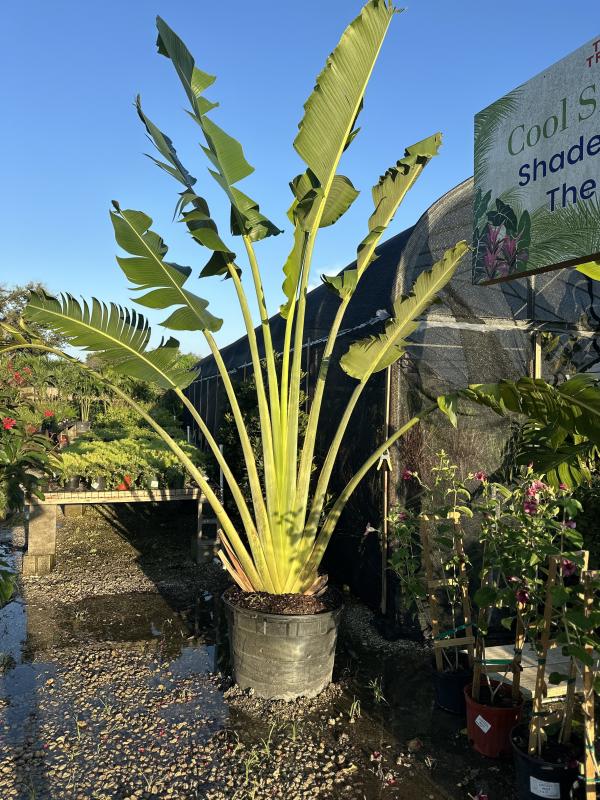 Traveler Palm (Ravenala madagascariensis) is a striking, large tropical plant known for its fan-like arrangement of broad, banana-shaped leaves that resemble a giant palm. Native to Madagascar, it is prized for its dramatic look and its ability to thrive in tropical and subtropical landscapes.