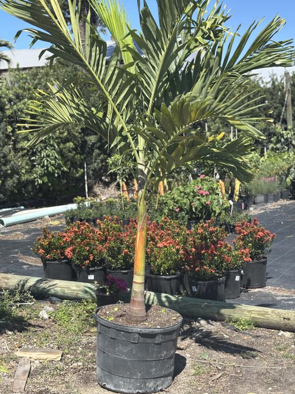 Christmas Palm (Adonidia merrillii), also known as Manila Palm, is a compact, elegant palm known for its smooth, gray trunk and arching fronds. It gets its name from the bright red fruits that appear in clusters during the holiday season, adding festive color to the landscape. It is ideal for small spaces, containers, or as a striking accent palm.