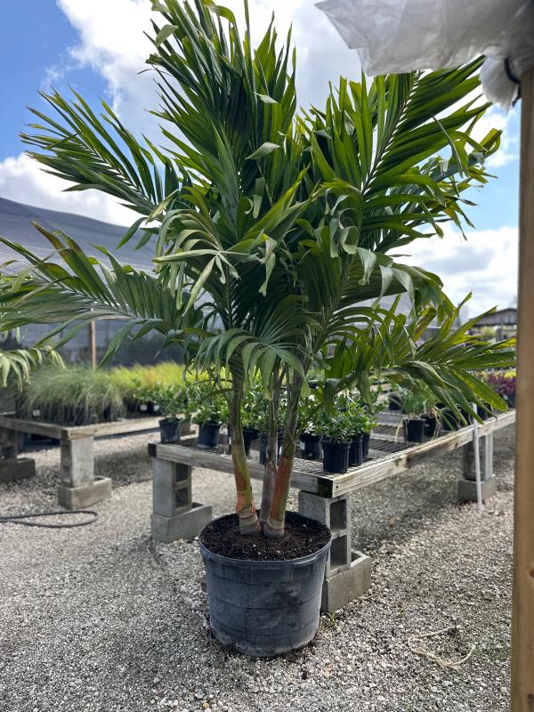 Christmas Palm (Adonidia merrillii), also known as Manila Palm, is a compact, elegant palm known for its smooth, gray trunk and arching fronds. It gets its name from the bright red fruits that appear in clusters during the holiday season, adding festive color to the landscape. It is ideal for small spaces, containers, or as a striking accent palm.