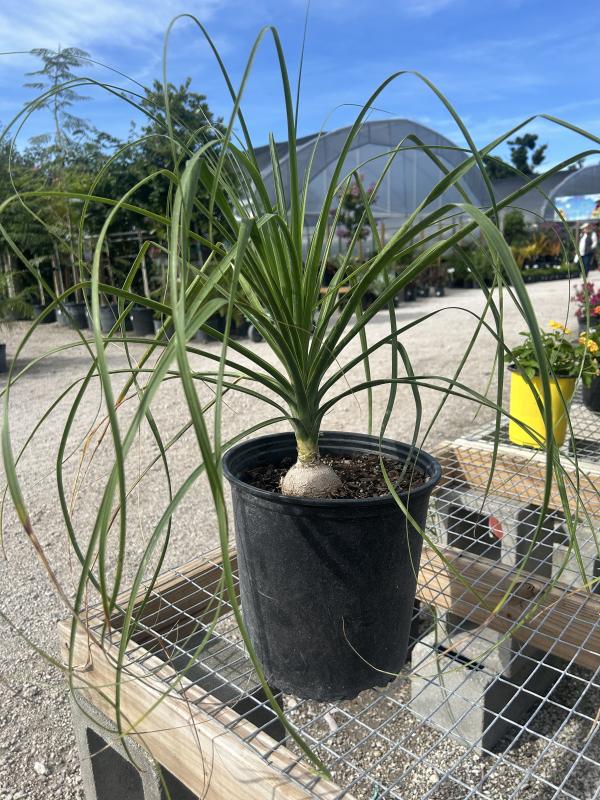 Ponytail Palm (Beaucarnea recurvata) is a unique, drought-tolerant succulent tree that features long, arching, narrow leaves resembling a ponytail. The plant has a swollen, bulbous trunk that stores water, making it highly resistant to dry conditions. It is often used as a statement plant in landscapes or containers, thriving in full sun and adding a tropical flair to gardens.
