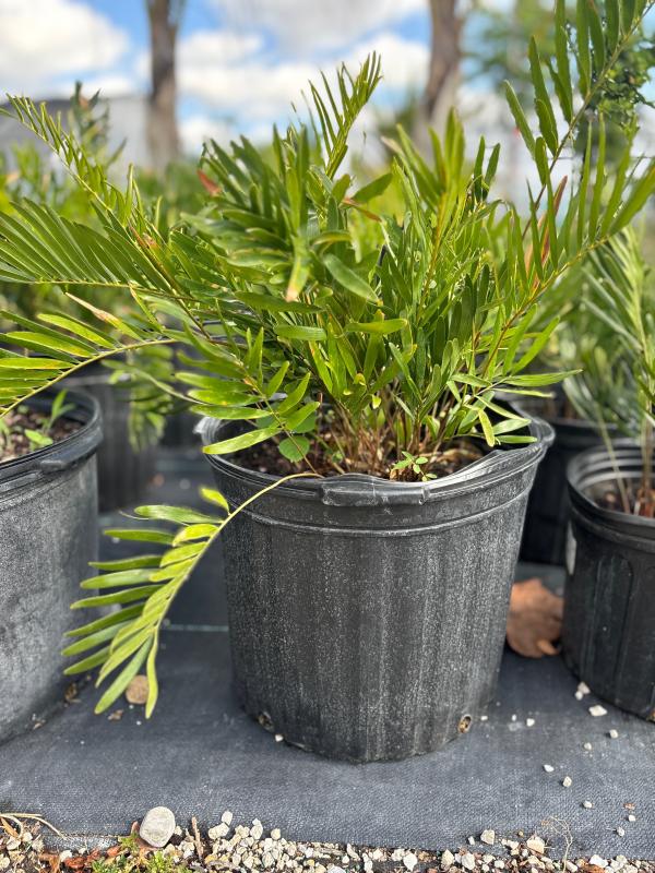 Coontie Palm (Zamia integrifolia) is a native Florida cycad known for its compact form and fern-like, glossy green leaves. Despite its name, it is not a true palm. This hardy, drought-tolerant plant is ideal for low-maintenance landscapes and works well as a groundcover, border, or specimen plant. It is also a host plant for the Atala butterfly.