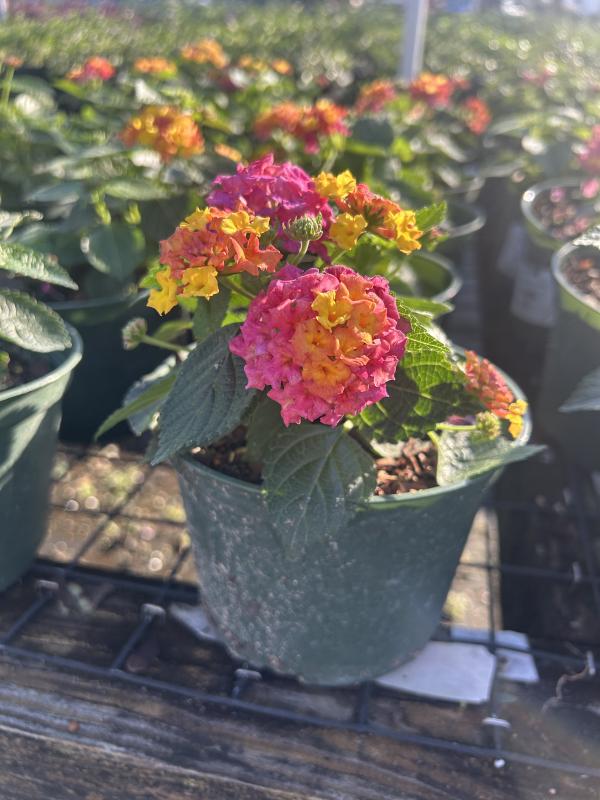 Lantana (Lantana camara) is a hardy, sun-loving plant celebrated for its brightly colored flower clusters and its ability to thrive in Florida's hot, humid climate. It attracts butterflies and pollinators, making it a favorite for wildlife gardens. It grows well in a variety of soils and is often used in borders, containers, or as a low-maintenance groundcover.
