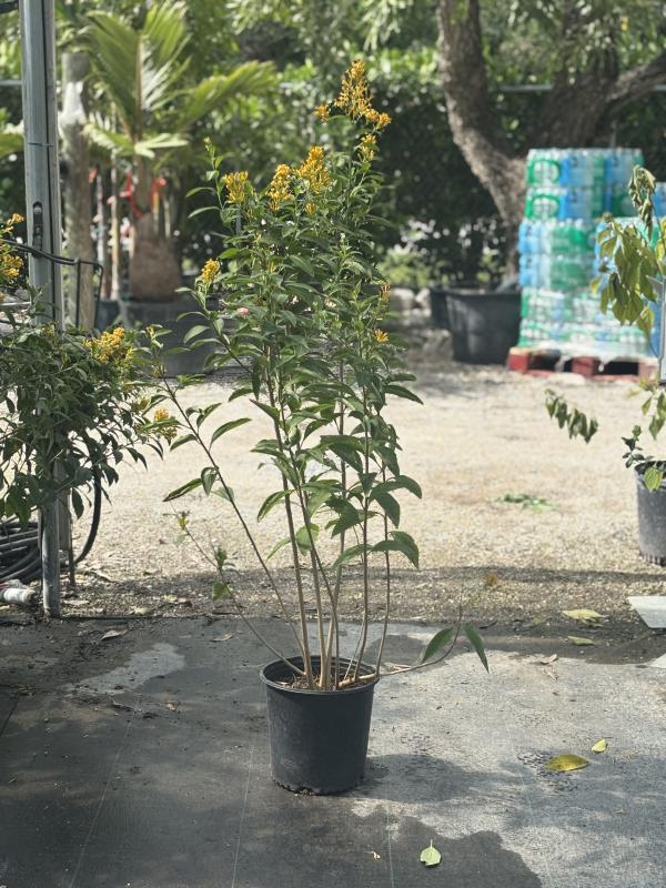 Cestrum (Cestrum spp.) is a tropical shrub known for its clusters of tubular, fragrant flowers that often bloom in the evening or at night. These blooms, which come in colors such as yellow, white, or red depending on the species, attract pollinators like moths and hummingbirds. The plant has a lush, bushy form and thrives in warm climates with well-drained soil.