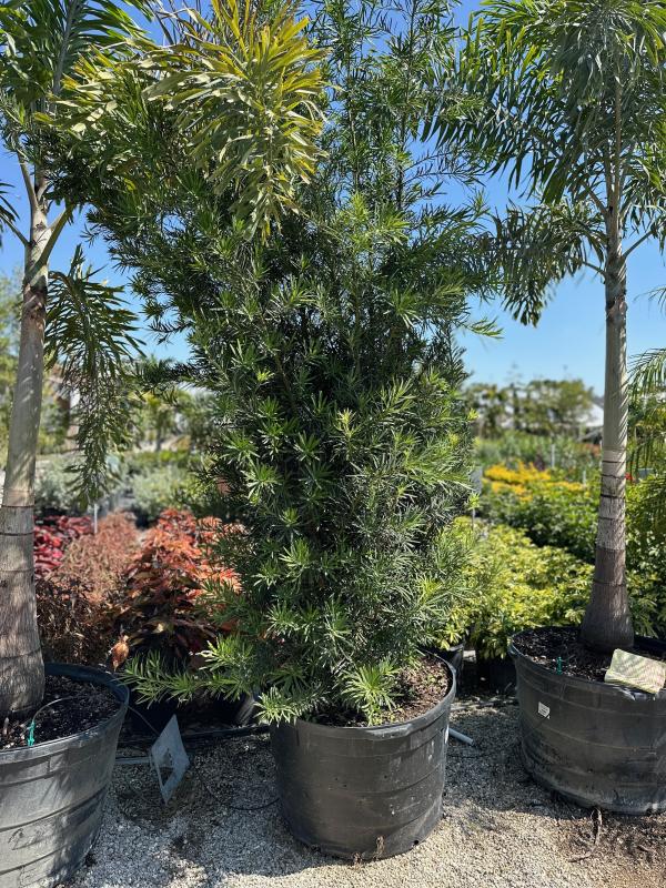 Maki Podocarpus (Podocarpus macrophyllus) is a versatile evergreen shrub with dense, dark green foliage. It thrives in a variety of soil types and can tolerate both full sun and partial shade, making it a popular choice for hedges, foundation plantings, or as a specimen plant in Florida landscapes. Its slow growth and minimal maintenance requirements add to its appeal for landscaping.