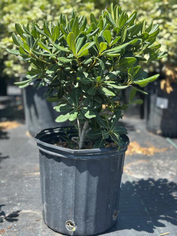 Pittosporum 'Green' (Pittosporum tobira 'Green') is a dense, evergreen shrub prized for its glossy, deep green foliage and compact growth habit. It forms a rounded mound and is often used for hedges, foundation plantings, or topiary. In spring, it produces small, creamy-white flowers with a sweet fragrance. This hardy plant is tolerant of drought and coastal conditions once established.