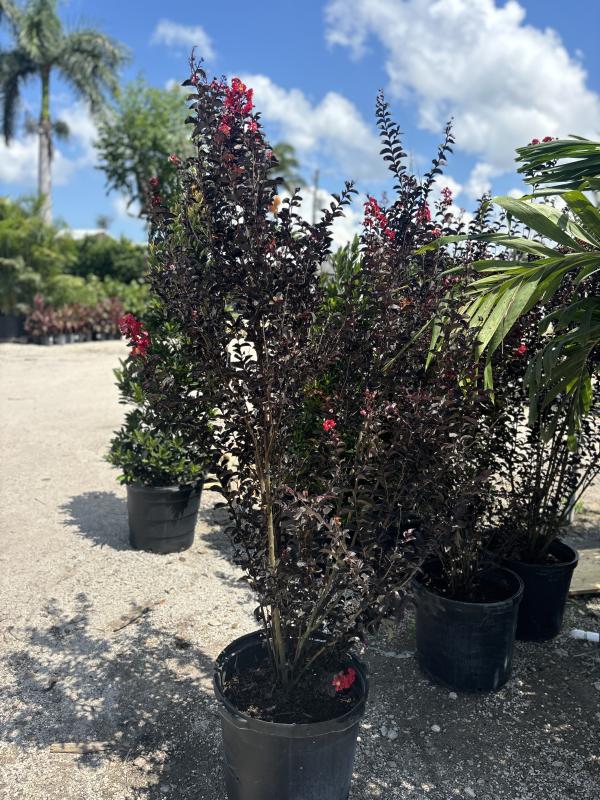 Crape Myrtle 'Ebony' (Lagerstroemia indica 'Ebony') is a striking ornamental tree valued for its deep burgundy to nearly black foliage and vivid summer flowers. Depending on the cultivar within the 'Ebony' series (such as Ebony Flame, Ebony Ivory, etc.), the blooms range in color from red to white. Its dramatic foliage and long blooming period make it a standout in any sunny landscape.