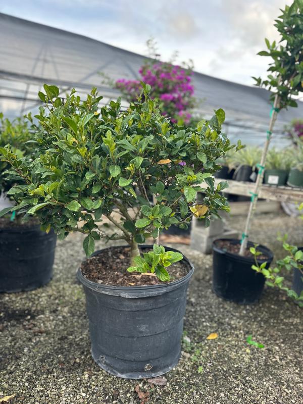 Gardenia Miami Supreme (Gardenia jasminoides 'Miami Supreme') is a fragrant, evergreen shrub known for its large, creamy white flowers that have a strong, sweet fragrance. This variety of gardenia is particularly valued for its ability to thrive in Florida's climate, offering lush green foliage and aromatic blooms from late spring to summer.