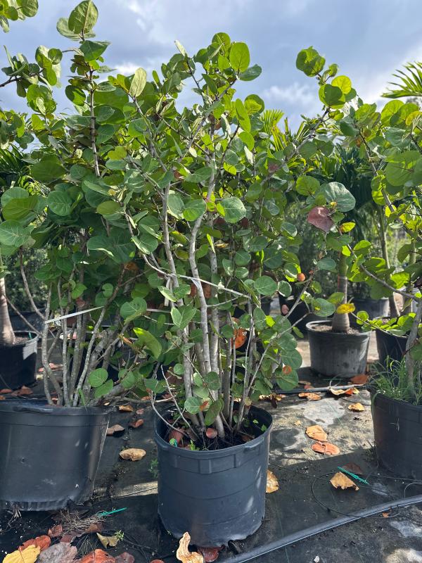 Sea Grape (Coccoloba uvifera) is a coastal shrub or small tree native to tropical beaches. It has large, round, leathery leaves that turn reddish in cooler weather and produces grape-like clusters of green to purple fruit. Sea Grape is highly salt-tolerant and excellent for stabilizing sandy shorelines and providing wildlife habitat.