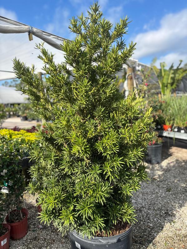 Podocarpus ‘Meta’ (Podocarpus macrophyllus 'Meta') is a refined, narrow evergreen shrub or small tree distinguished by its dark green, leathery, yew-like foliage arranged in dense spirals. While naturally reaching 15–20 ft tall, it matures more compactly (8–12 ft tall, 4–6 ft wide) in landscapes, making it ideal for formal hedges, screens, topiary, or container specimens. Its adaptable growth in full sun to partial shade, combined with its salt, drought, and deer resistance, makes it a versatile and low‑maintenance choice for Florida gardens.