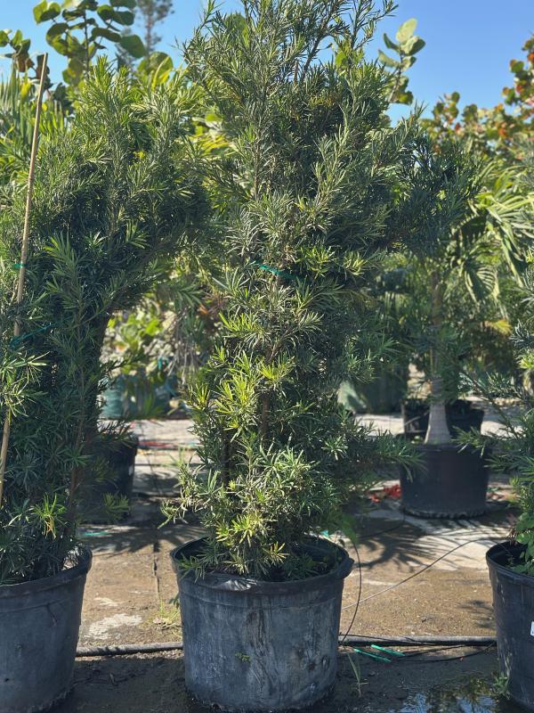 Maki Podocarpus (Podocarpus macrophyllus) is a versatile evergreen shrub with dense, dark green foliage. It thrives in a variety of soil types and can tolerate both full sun and partial shade, making it a popular choice for hedges, foundation plantings, or as a specimen plant in Florida landscapes. Its slow growth and minimal maintenance requirements add to its appeal for landscaping.