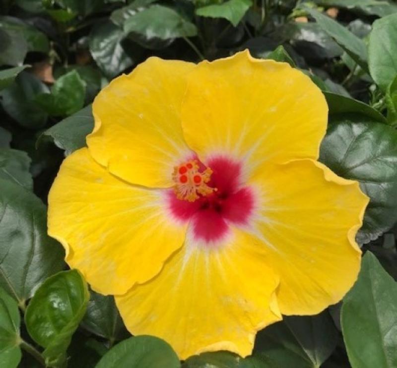 Lilikoi Yellow Hibiscus (Hibiscus rosa-sinensis 'Lilikoi Yellow') is a stunning tropical shrub known for its large, bright yellow, trumpet-shaped flowers and glossy green foliage. This eye-catching plant is perfect for adding a splash of color to gardens, borders, and containers, and it blooms prolifically throughout the warmer months.