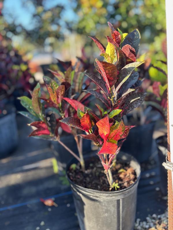 Croton (Codiaeum variegatum) is a bold, tropical shrub known for its brilliantly colored foliage in shades of red, yellow, orange, green, and even purple. Its leathery, glossy leaves come in a variety of shapes, and it makes an excellent focal point in landscapes or as a container plant in warm climates. Crotons prefer humidity and bright, indirect light but can tolerate some direct sun.