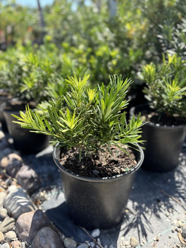 Pringle Podocarpus (Podocarpus macrophyllus 'Pringle'), also known as the Yew Pine or Japanese Yew, is an evergreen shrub or small tree known for its dense, dark green foliage and upright growth habit. It is often used in hedges, screens, and topiary due to its adaptability and easy maintenance.