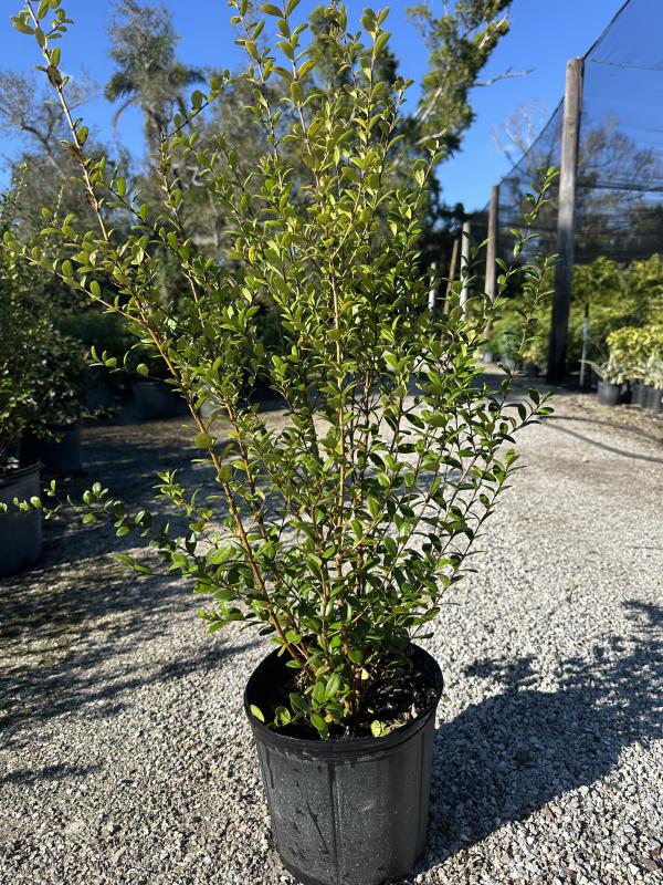Simpson Stopper (Myrcianthes fragrans) is a dense, evergreen shrub native to Florida, often used as a hedge or foundation plant. It features small, glossy green leaves and produces fragrant white flowers followed by dark purple berries that attract birds. It is drought-tolerant and moderately salt-tolerant, thriving in full sun to partial sun conditions.