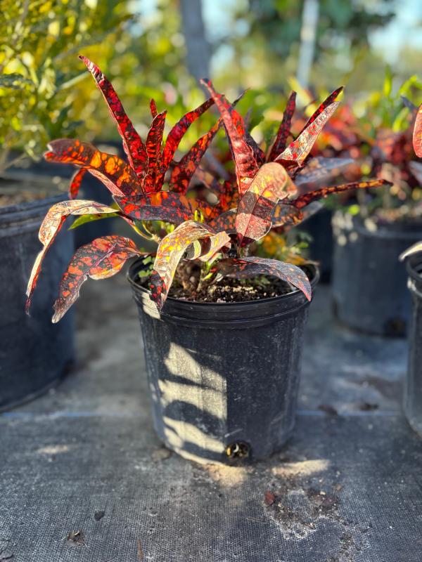 Croton (Codiaeum variegatum) is a bold, tropical shrub known for its brilliantly colored foliage in shades of red, yellow, orange, green, and even purple. Its leathery, glossy leaves come in a variety of shapes, and it makes an excellent focal point in landscapes or as a container plant in warm climates. Crotons prefer humidity and bright, indirect light but can tolerate some direct sun.