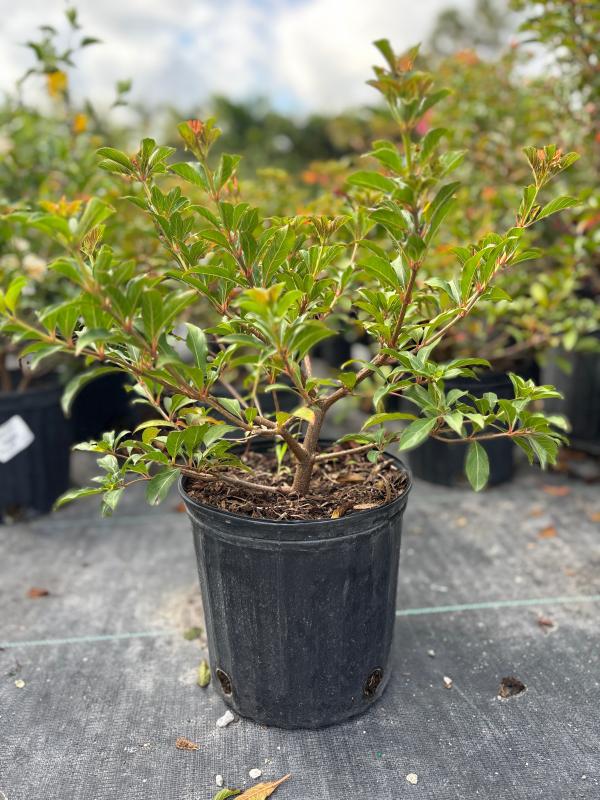 Dwarf Firebush (Hamelia patens 'Dwarf') is a compact, flowering shrub known for its vibrant orange tubular flowers that attract hummingbirds and butterflies. It features glossy green foliage and blooms profusely throughout the warmer months, making it a colorful and low-maintenance addition to gardens.