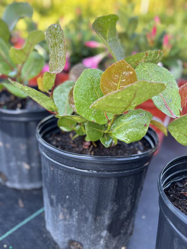 Sea Grape (Coccoloba uvifera) is a coastal shrub or small tree native to tropical beaches. It has large, round, leathery leaves that turn reddish in cooler weather and produces grape-like clusters of green to purple fruit. Sea Grape is highly salt-tolerant and excellent for stabilizing sandy shorelines and providing wildlife habitat.