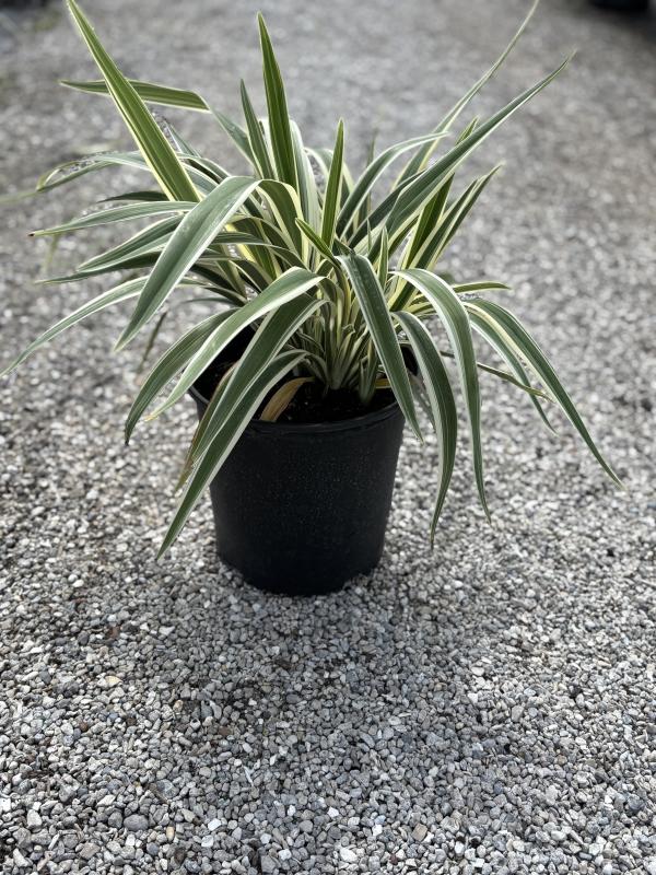 Variegated Flax Lily (Dianella tasmanica 'Variegata') is a striking, evergreen perennial known for its attractive, strap-like leaves with bold white and green variegation. In spring and summer, it produces small, star-shaped blue flowers followed by decorative blue berries. This low-maintenance plant is perfect for adding texture and color to borders, mass plantings, and containers.