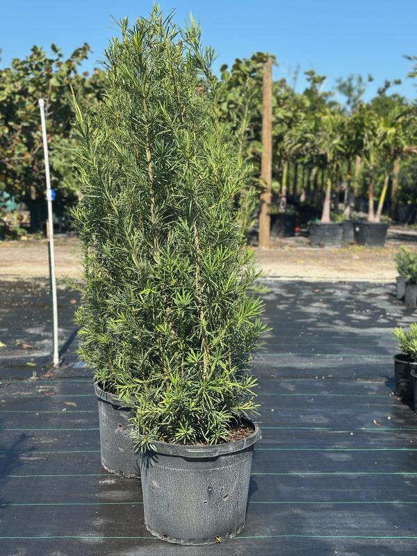 Maki Podocarpus (Podocarpus macrophyllus) is a versatile evergreen shrub with dense, dark green foliage. It thrives in a variety of soil types and can tolerate both full sun and partial shade, making it a popular choice for hedges, foundation plantings, or as a specimen plant in Florida landscapes. Its slow growth and minimal maintenance requirements add to its appeal for landscaping.