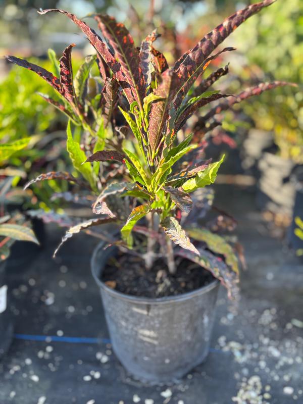 Croton (Codiaeum variegatum) is a bold, tropical shrub known for its brilliantly colored foliage in shades of red, yellow, orange, green, and even purple. Its leathery, glossy leaves come in a variety of shapes, and it makes an excellent focal point in landscapes or as a container plant in warm climates. Crotons prefer humidity and bright, indirect light but can tolerate some direct sun.