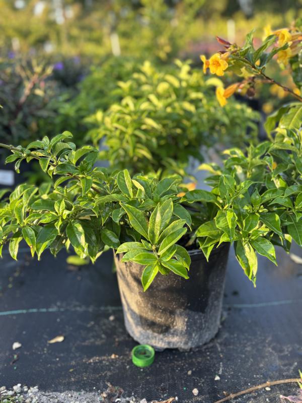 Allamanda Bush (Allamanda cathartica) is a tropical shrub known for its large, showy, trumpet-shaped yellow flowers and glossy green foliage. It is often used in gardens or as a hedge, thriving in full sun and adding a bold, colorful display through the warmer months.