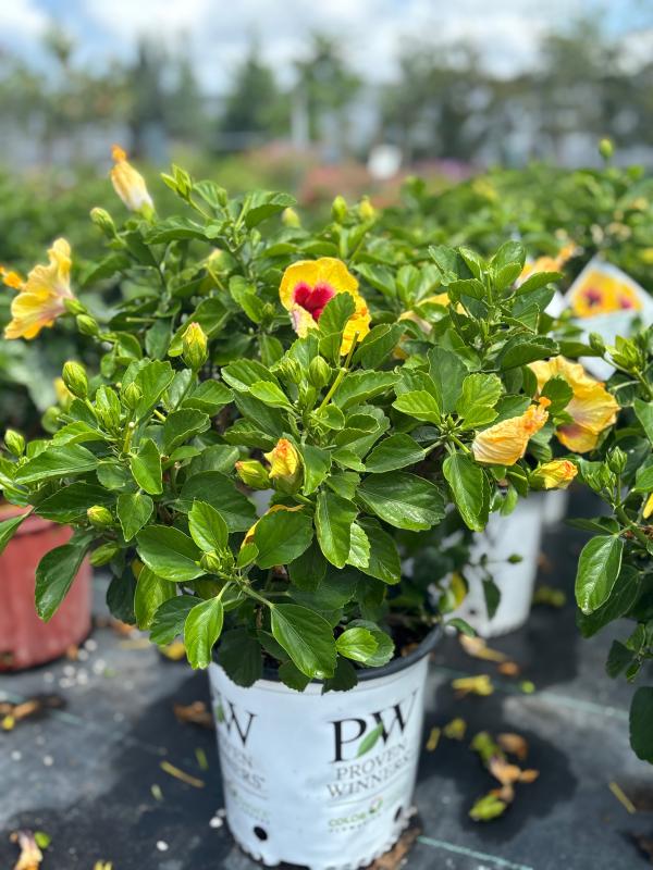 Hibiscus 'Hollywood Rico Suave' (Hibiscus rosa-sinensis 'Hollywood Rico Suave') is a vibrant tropical hibiscus celebrated for its bold yellow blooms with a striking red eye. As part of the Hollywood series, this cultivar offers a long blooming season and a compact, bushy growth habit, making it ideal for garden beds, borders, and containers.