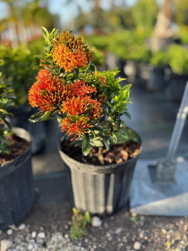Dwarf Carmen Orange Ixora (Ixora chinensis 'Dwarf Carmen Orange') is a compact tropical shrub known for its vibrant clusters of bright orange, star-shaped flowers and glossy, dark green foliage. This evergreen plant is ideal for adding a splash of color to smaller gardens, borders, and containers, with its abundant blooms providing visual interest throughout much of the year.