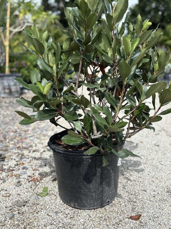 Indian Hawthorne (Rhaphiolepis indica) is a dense, compact evergreen shrub with glossy, leathery green leaves and a rounded form. It produces clusters of small, white flowers in spring, which are followed by dark blue-black berries. This shrub is commonly used in landscaping for hedges, borders, or as an accent plant due to its attractive foliage and vibrant blooms.