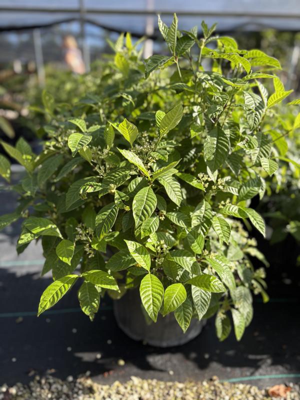 Wild Coffee (Psychotria nervosa) is a native Florida shrub valued for its lush, glossy green foliage and clusters of small white flowers followed by bright red berries. It thrives in shaded landscapes and attracts birds and pollinators, making it ideal for naturalistic or wildlife-friendly gardens. Its tolerance for dry shade conditions makes it a versatile addition to South Florida yards.