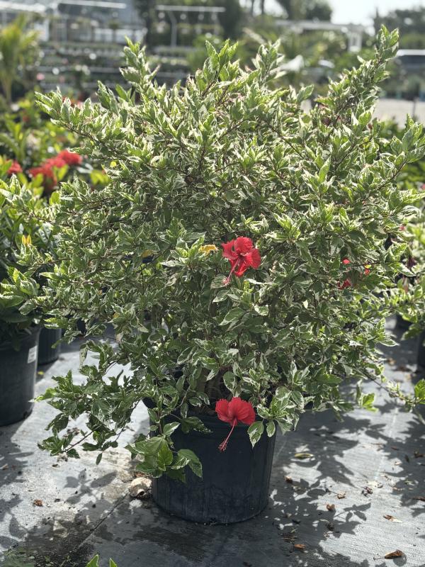 Snow Queen Hibiscus (Hibiscus rosa-sinensis 'Snow Queen') is a distinctive tropical shrub known for its variegated foliage and striking red flowers. The glossy green leaves are splashed with white and pink, creating a stunning backdrop for the vibrant blooms. This unique plant is ideal for adding visual interest to gardens, borders, and containers, with year-round foliage color and seasonal flowers.