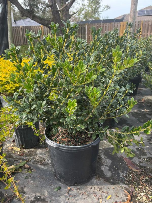 Dwarf Burford Holly (Ilex cornuta 'Dwarf Burford') is a compact, evergreen shrub prized for its glossy, dark green leaves and bright red berries. It is a hardy, low-maintenance plant that works well for hedges, borders, or foundation plantings. This holly is drought-tolerant once established and provides year-round interest in the landscape.