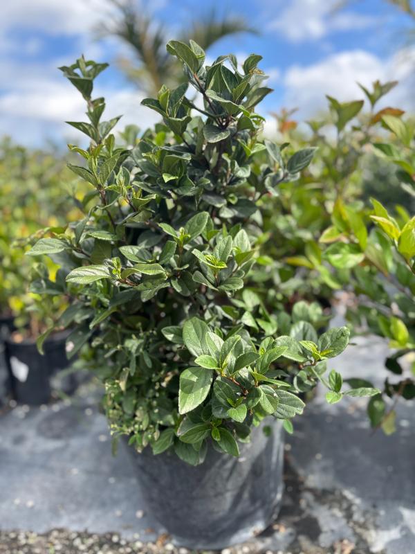 Viburnum suspensum (Viburnum suspensum) is a dense, compact evergreen shrub known for its leathery, dark green foliage and rounded, bushy form. It is commonly used in landscaping as a hedge, border, or foundation plant due to its versatility and attractive, year-round appearance. This shrub is hardy, drought-tolerant, and can tolerate a variety of soil types, making it a popular choice for both residential and commercial landscapes.