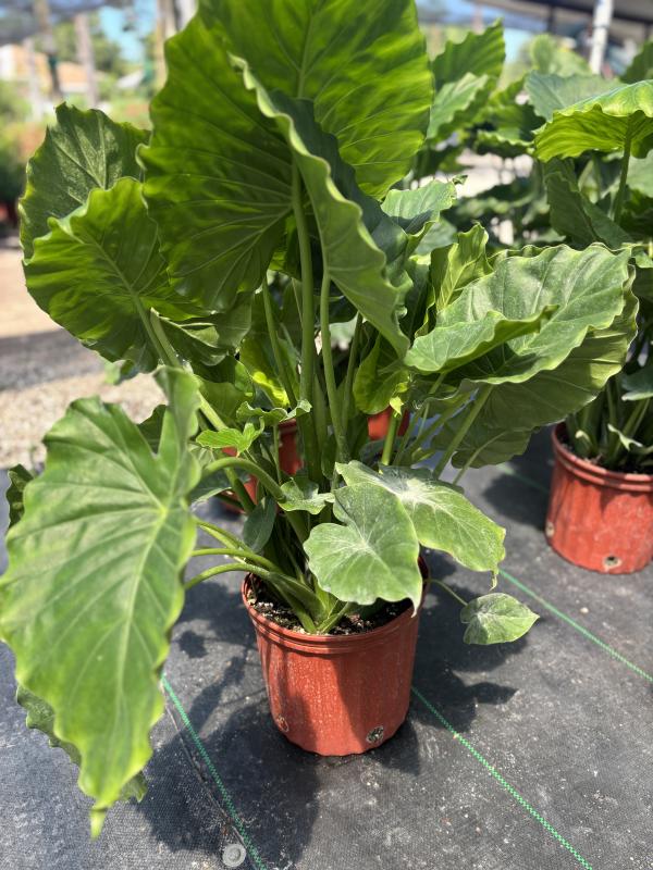 Alocasia (Alocasia spp.), commonly known as elephant ear or African mask plant, is a striking tropical plant celebrated for its dramatic foliage. Its large, heart- or arrow-shaped leaves, often with prominent veins, come in a variety of colors, including deep green, silver, and purple hues. This versatile plant adds an exotic feel to landscapes or as a statement piece in containers, thriving in warm and humid environments.